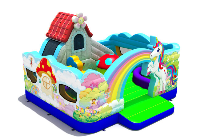 Dry Only - Wanna take a visit to the unicorns’ domain, with giant mushrooms, rainbows, colorful flowers, and fairies? You can do this via our unicorn inflatable playground. This is a super fun bouncy playground for kids who love the legendary creature. Besides the part of jumping, it also provides a ball pit, several obstacles and an inflatable slide.
